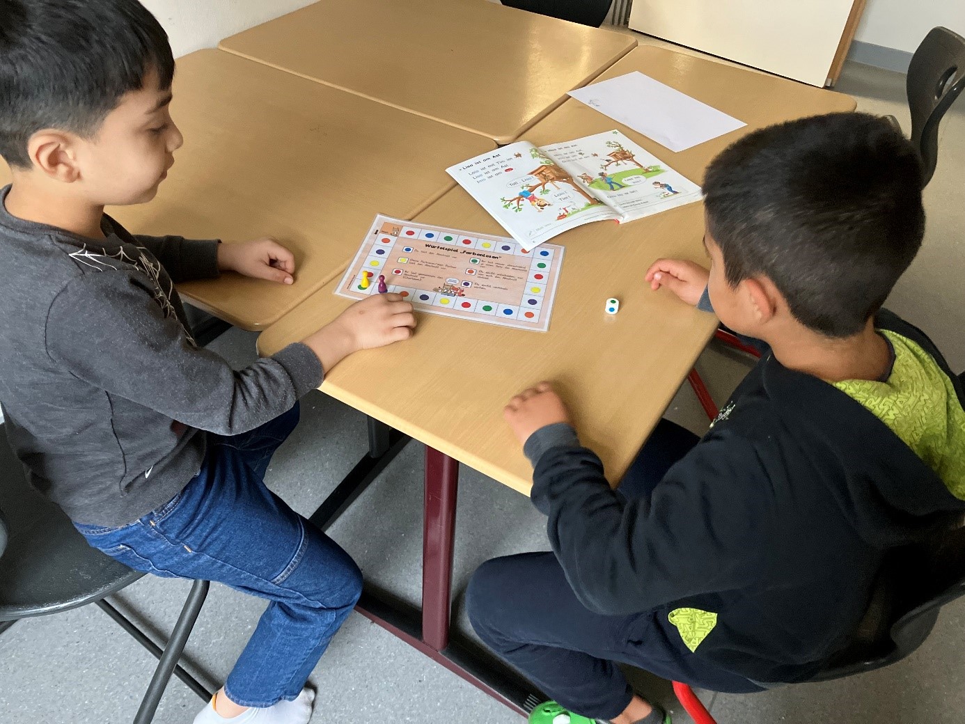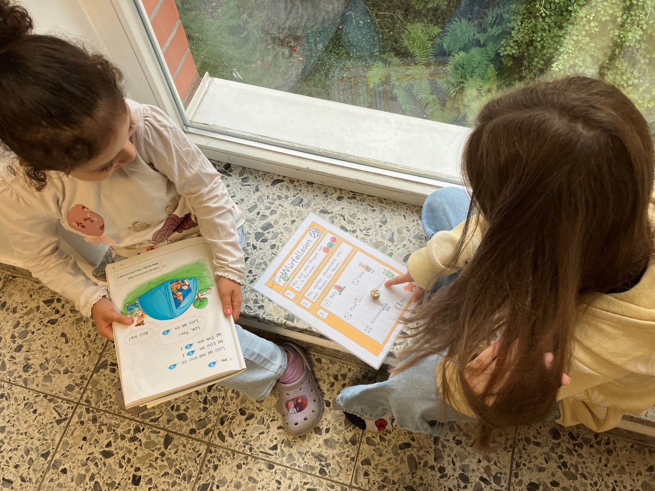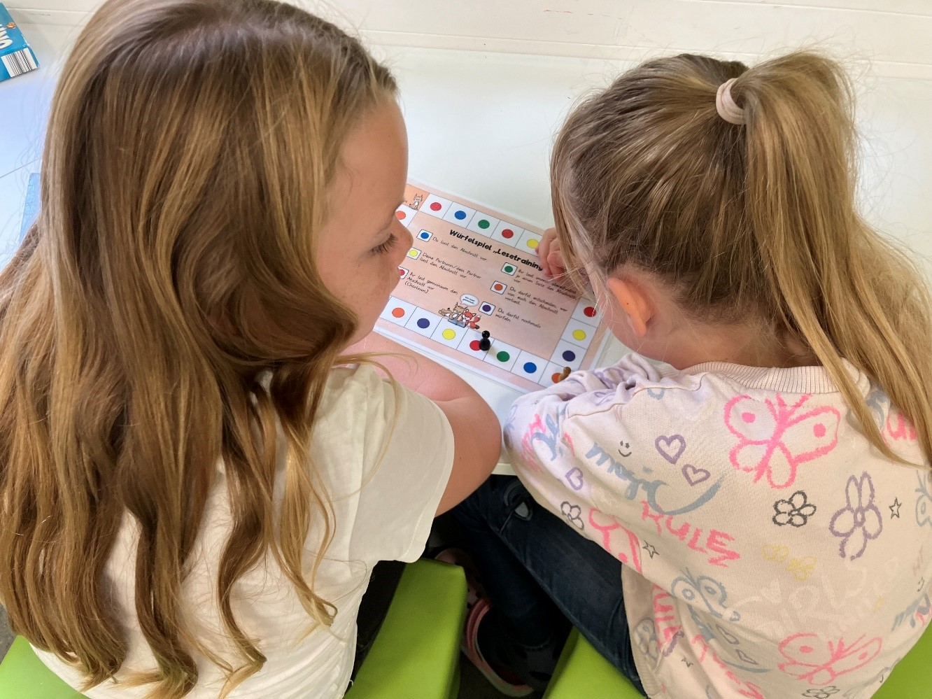 Wenn die Schülerinnen und Schüler unserer 2. Klassen zuerst unter dem Tisch sitzen, später auf dem Stuhl und zum Schluss sogar auf dem Tisch stehen, dann ist Lesestunde angesagt. Ob spielerisch, mit motivierenden Bildkarten, dem IPad, alleine oder zu zweit, das Lesen steht im Vordergrund und die Kinder haben viel Spaß daran.