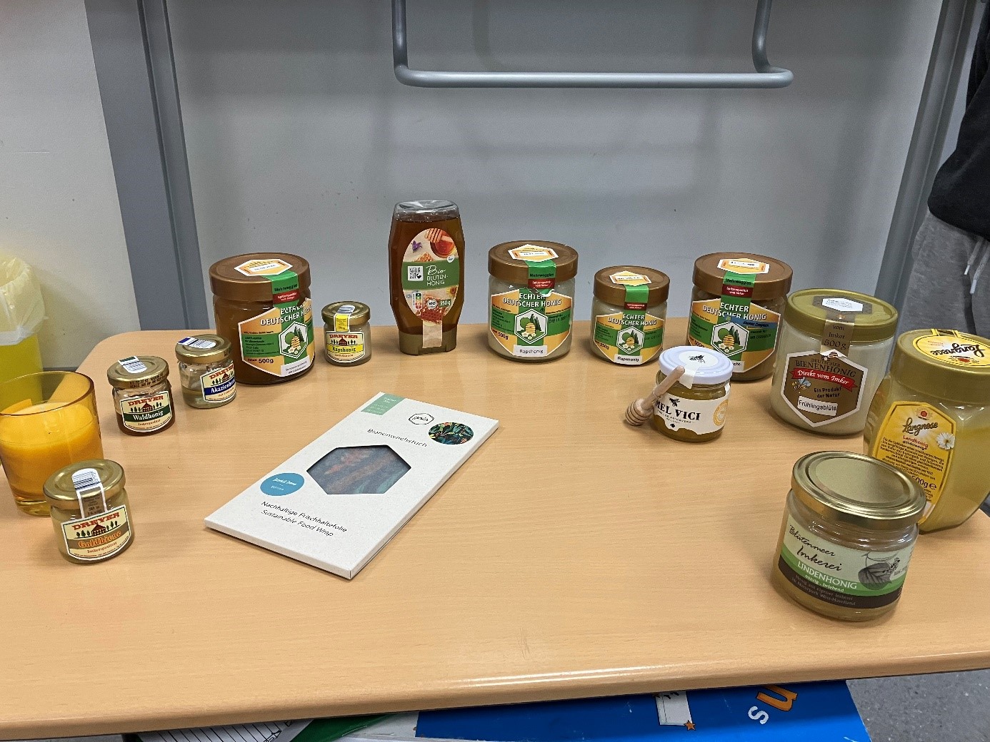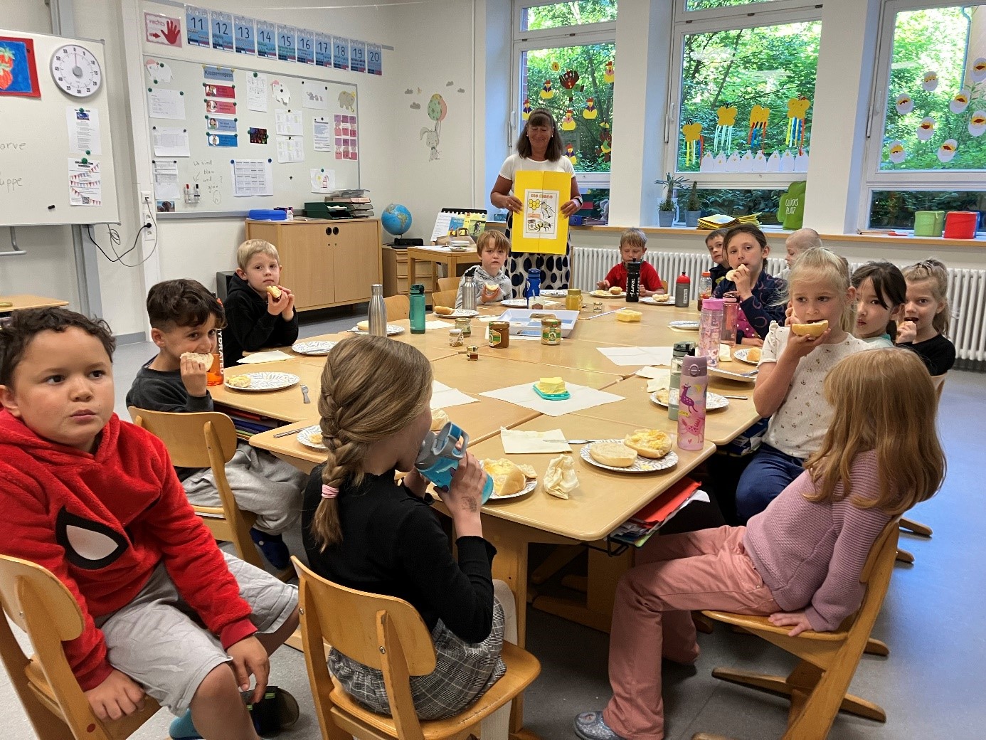 Im Rahmen der Unterrichtseinheit zum Thema „Bienen“ haben unsere Erstklässlerinnen und Erstklässler unterschiedliche Honigsorten von zuhause zum Kennenlernen mitgebracht. Anschließend wurde in allen drei 1. Klassen mit Brötchen und Honig gefrühstückt. Den Kindern schmeckte es.