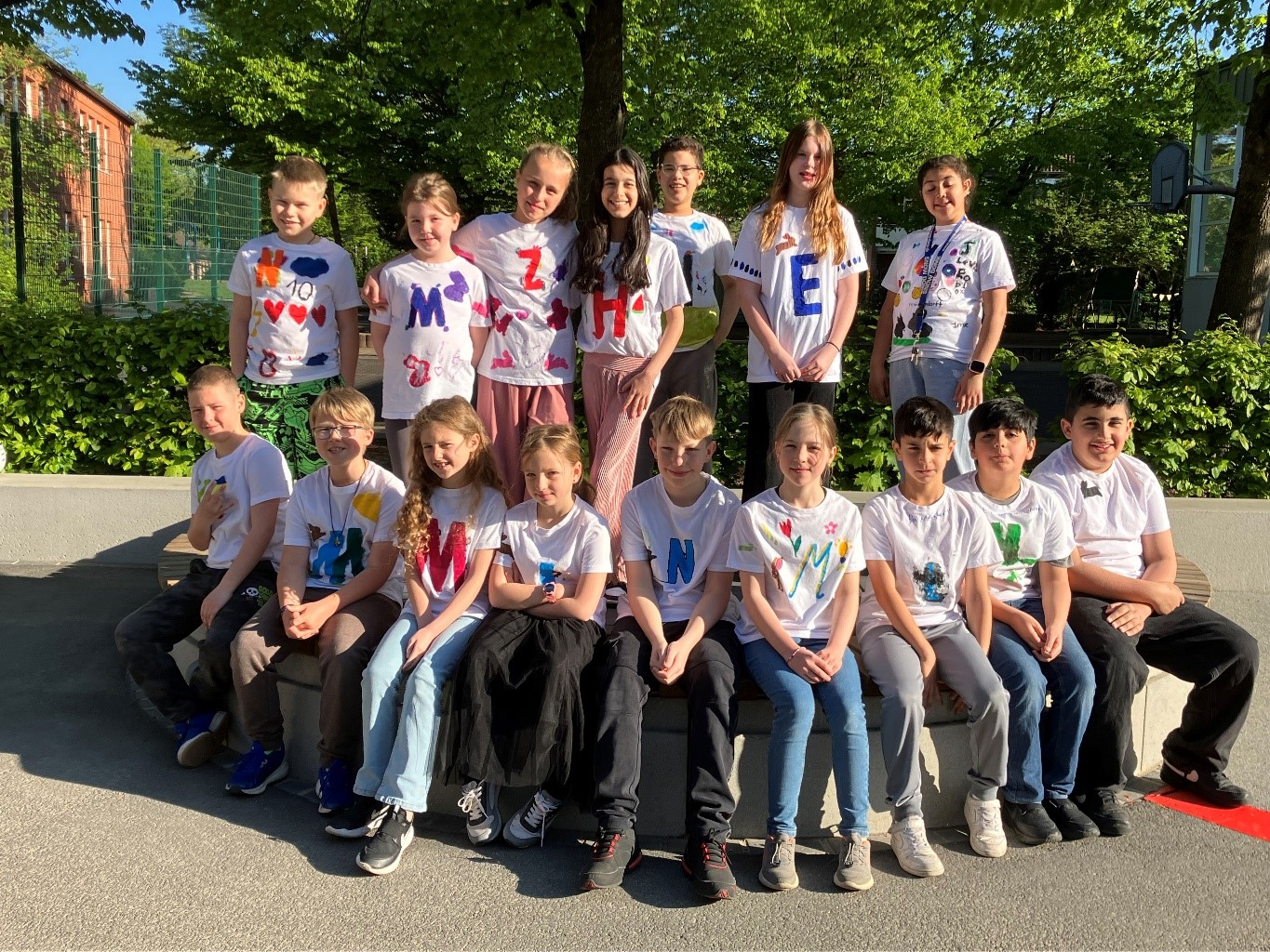 Ganz nach dem Schulmotto „Wir sind bunt“ hat die Klasse 4c bunte T-Shirts gestaltet. So bunt und vielfältig wie die Klasse ist, so individuell sind die T-Shirts geworden. Die gemeinsamen Elemente wie den Buchstaben und das Hasensymbol stellen neben der Vielfalt gleichzeitig eine Verbundenheit dar.