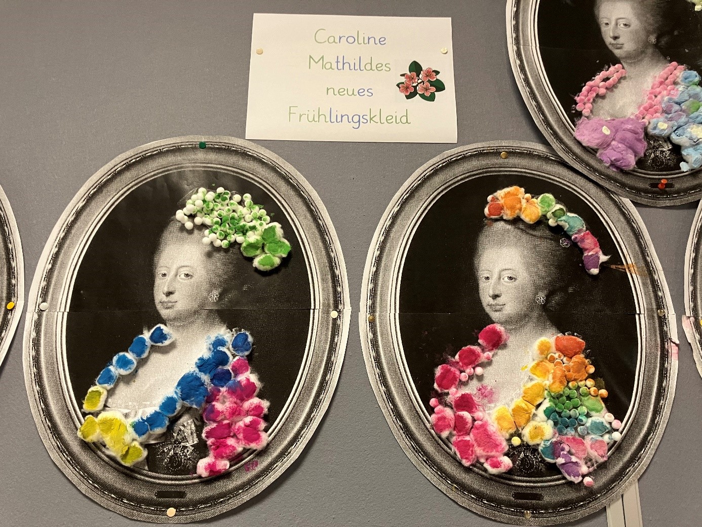 Zur Erinnerung an die in Celle verstorbene Königin Caroline Mathilde von Dänemark, die in Celle mit nur 23 Jahren starb, wird zurzeit im Celler Schlosstheater ein Theaterstück über die junge Königin aufgeführt. Auch eine Ausstellung im Schloss erinnert an sie. Und die Kinder der Klasse 1b haben sich an der Ausstellung auf ihre Art beteiligt.