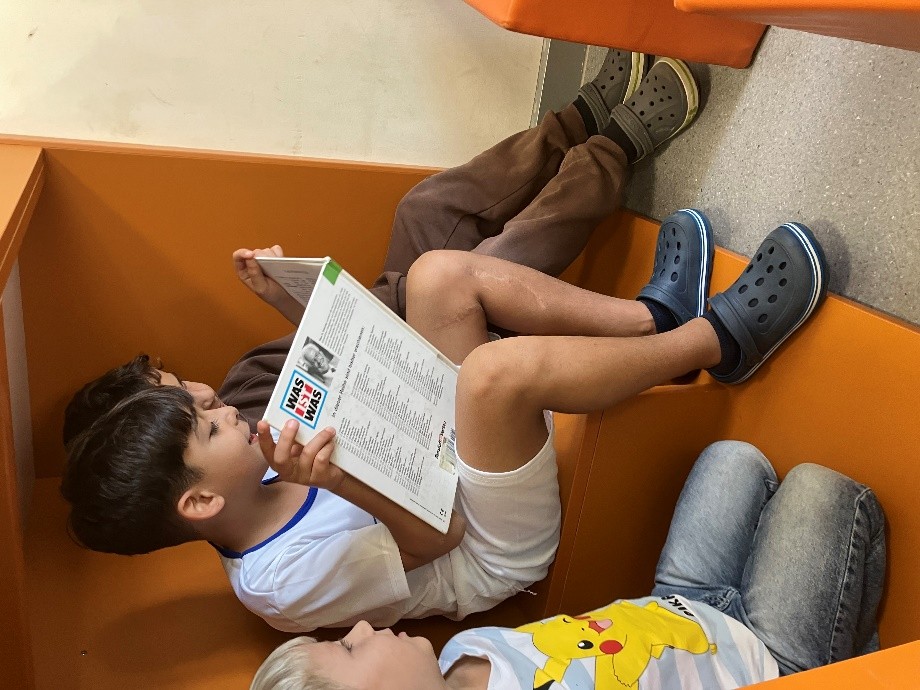 Die Kinder der Klasse 3a lesen den Kindern aus der Klasse 1a ihr Lieblingsbuch vor. Geduldig und engagiert kümmerten sich „die Großen“ um ihre Schützlinge und werden dafür von den Zuhörerkindern bewundert und wertgeschätzt. Beide Seiten können dabei viel voneinander profitieren und haben viel Freude daran.