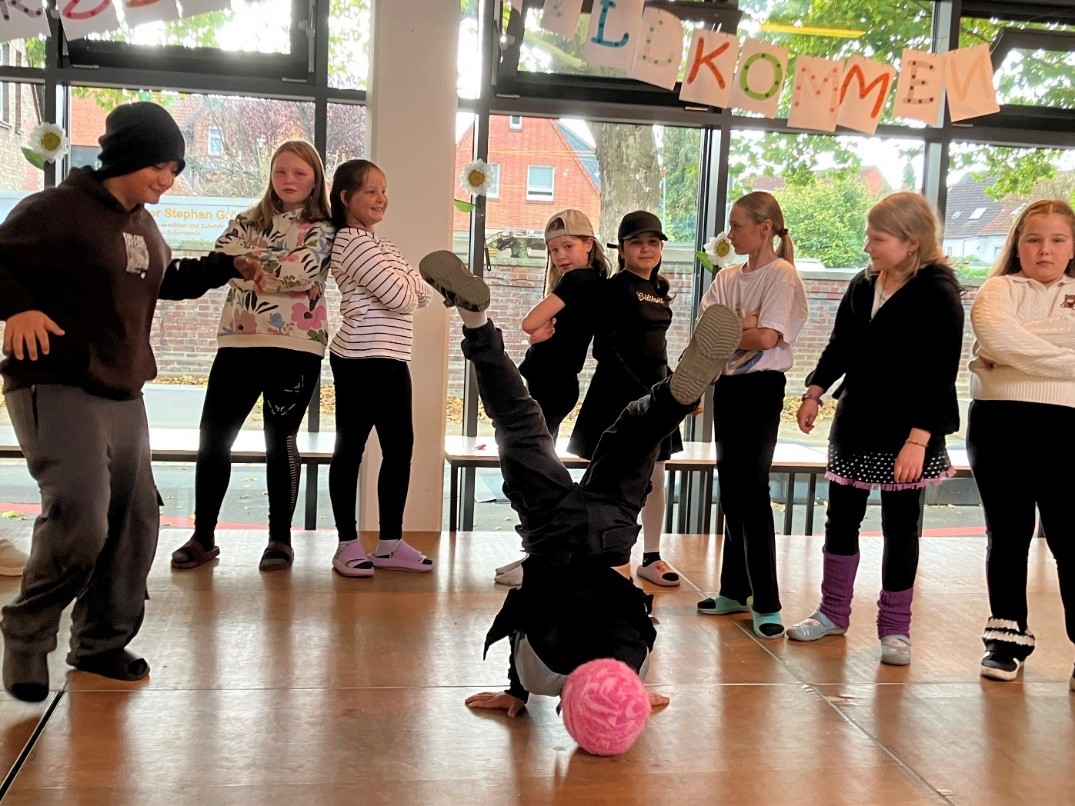 Durch das Programm führten Emma und Negin aus der Klasse 4a. Diese Klasse überzeugte mit einem großartigen Tanz mit Breakdance-Einlage.