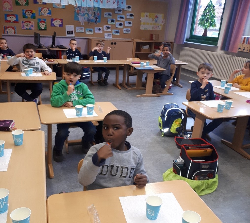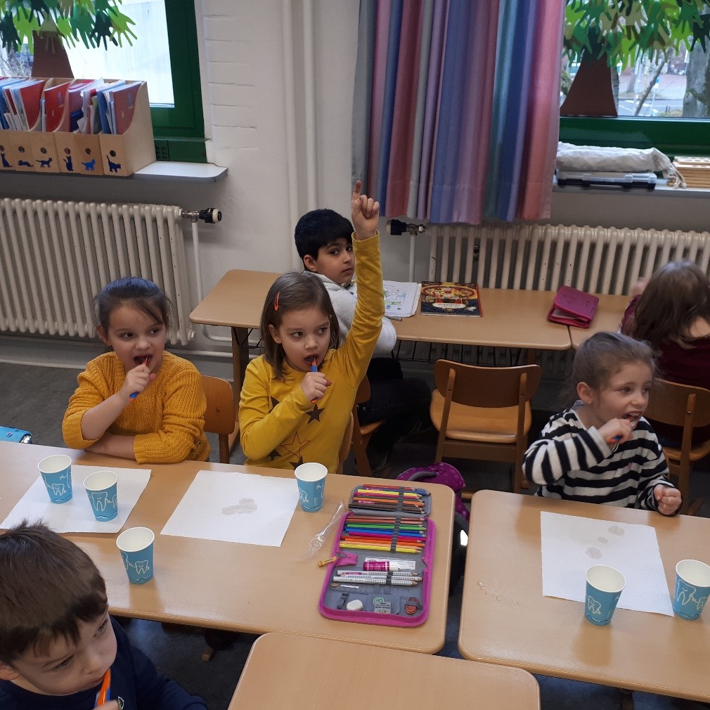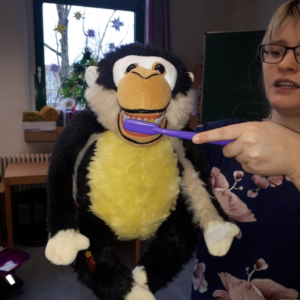 Frau Stoiber vom Gesundheitsamt Celle hat unseren 1. Klassen noch einmal gezeigt, wie die Zähne richtig geputzt werden. Dazu haben alle gemeinsam einen Bewegungsspruch aufgesagt. Drei Minuten Zähneputzen dauert ganz schön lange. Und die Zeit vergeht überhaupt nicht, wenn man die Zahnbürste nur im Mund hat, ohne etwas zu tun. Wenn man allerdings die Zähne richtig putzt (zuerst die Kauflächen, dann die Vorderseiten und zum Schluss die Innenseiten), dann verfliegt die Zeit ganz schnell. Das regelmäßige Zähneputzen ist so wichtig, damit die Zähne nicht kaputtgehen. Auch der regelmäßige Zahnarztbesuch ist wichtig, falls doch einmal ein Loch auftaucht, damit die Bakterien schnell wieder entfernt werden und das Loch zugemacht wird.