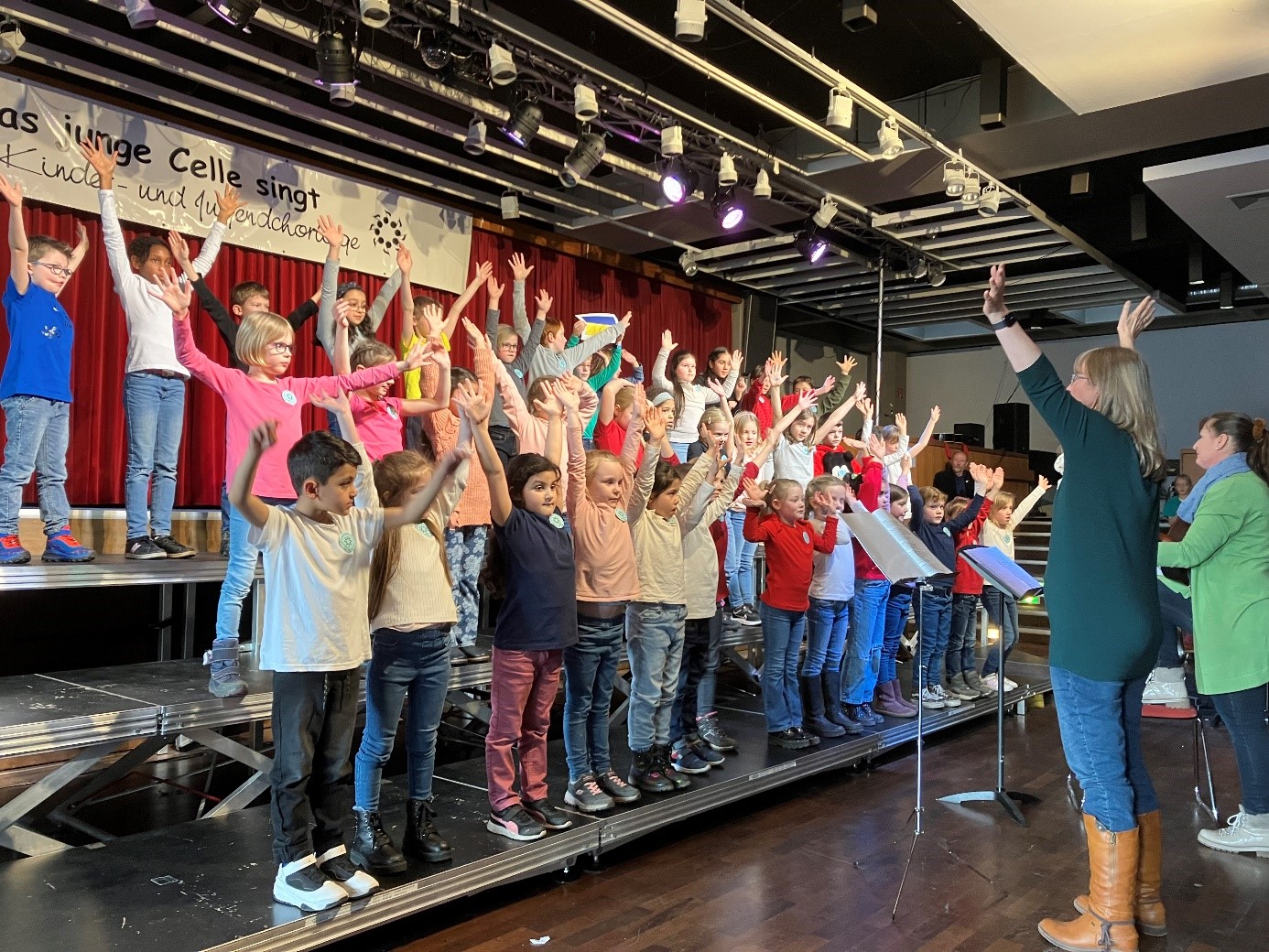 Premiere für unsern Chor der 1. und 3. Klassen bei den Celler Kinder- und Jugendchortagen. Die Kinder zeigten unter der Leitung von Frau Stephany und Frau Graß-Suray ihre Begeisterung für das Singen im Chor. Ob beim Rhythmical „Hallo Kinder, es geht los“, mit unserer Schulhymne oder unserem Friedenslied waren die Kinder sichtbar engagiert bei der Sache und konnten das Publikum wahrlich begeistern.