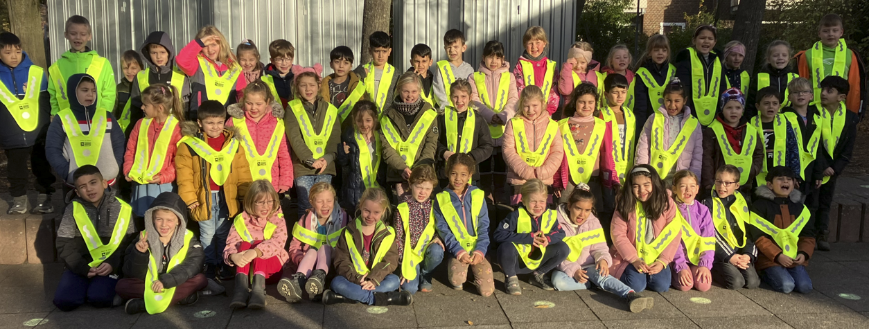 Unsere Erstklässler wurden mit einem reflektierenden Dreiecksüberwurf ausgestattet, der nun in der dunklen Jahreszeit täglich genutzt werden soll.