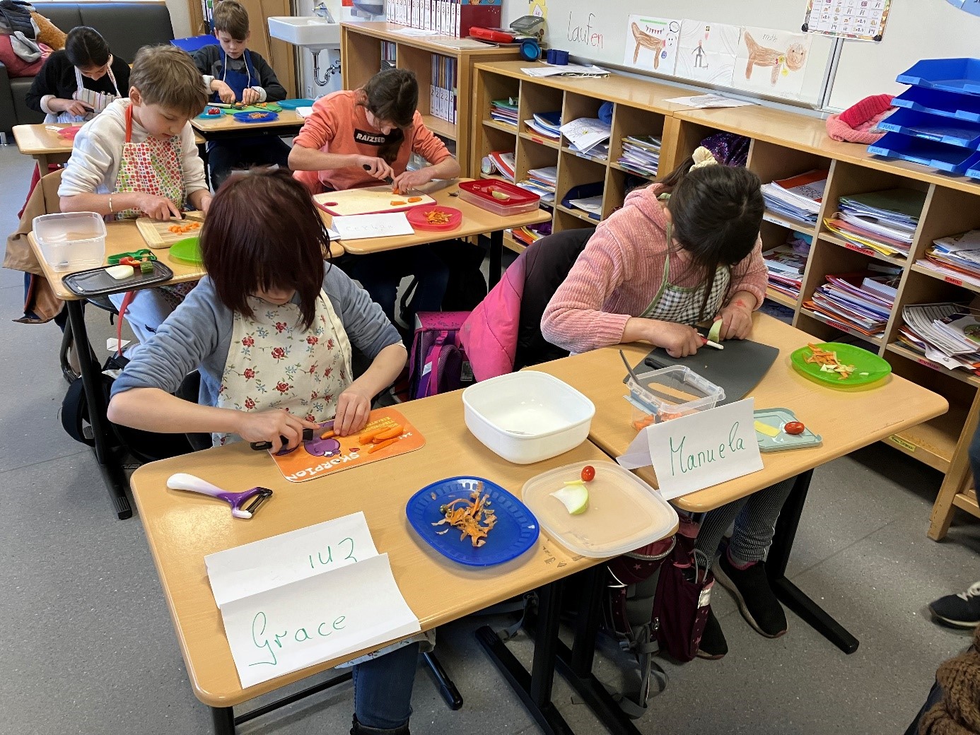 In sechs Doppelstunden wurden unseren Drittklässlern erste Grundlagen für eine gesundheitsbewusste Ernährung in Theorie und Praxis vermittelt. Die Lehrbeauftragte des Deutschen Landfrauenverbandes, Frau Elke Meier-Knoop, half den Kindern unterschiedliche Lebensmittel zu entdecken und kleine Gerichte gemeinsam zuzubereiten. Dabei wurden fast automatisch wichtige Arbeitstechniken, vom Vorbereiten der Speisen bis zum Tischdecken erlernt. Es wurde auch eine theoretische Prüfung abgelegt, so dass den Kindern zum Abschluss ein „Ernährungsführerschein“ übergeben werden konnte.