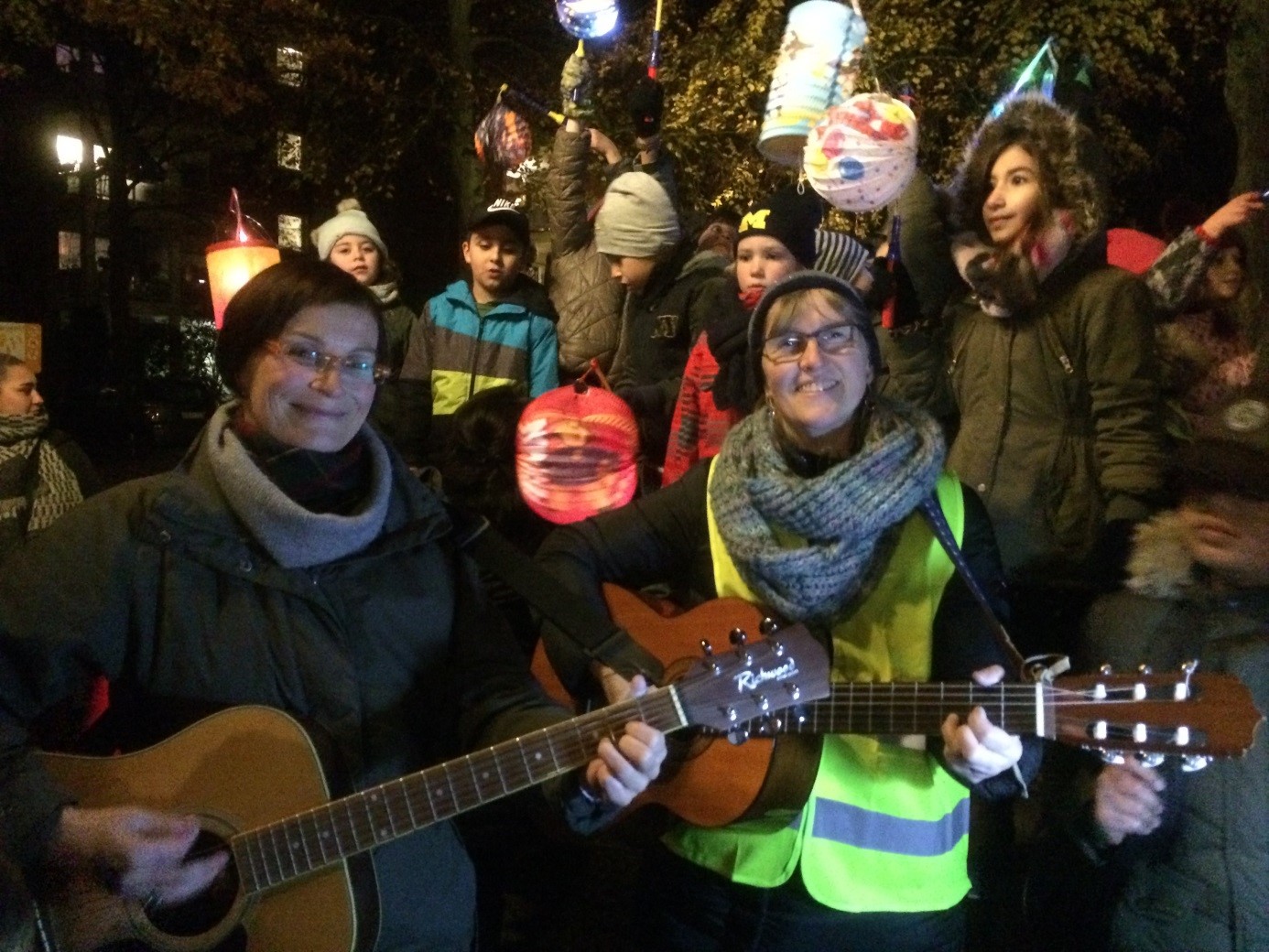 Nach Einbruch der Dunkelheit sammelten sich alle Kinder in freudiger Erwartung mit ihren Laternen zusammen mit Geschwistern und Eltern auf dem Schulhof. Nach gemeinsamen Laternenliedern schloss sich der Umzug durch die anliegenden Straßen an, wobei die riesige Laternenschlange ein imposantes Bild bot. Der Umzug stoppte mehrmals, um die vielen eingeübten Laternenlieder zu singen.