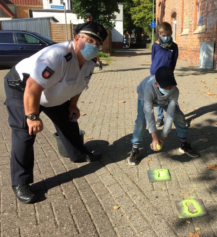 Am Anfang des Schuljahres führte die Polizei Celle die alljährliche Schulanfangsaktion an unserer Schule durch. Um die Sicherheit auf dem Schulweg zu erhöhen, weisen nun Markierungen in Form von kleinen gelben Füßen auf den Standort der GS Blumlage / Altstadt hin. Mit Schablone und gelber Sprühfarbe bewaffnet, brachten der Verkehrssicherheitsberater der Polizei Celle, Karsten Wiechmann, zusammen mit der Klasse 3b die knallgelben Fußstapfen auf den Asphalt.