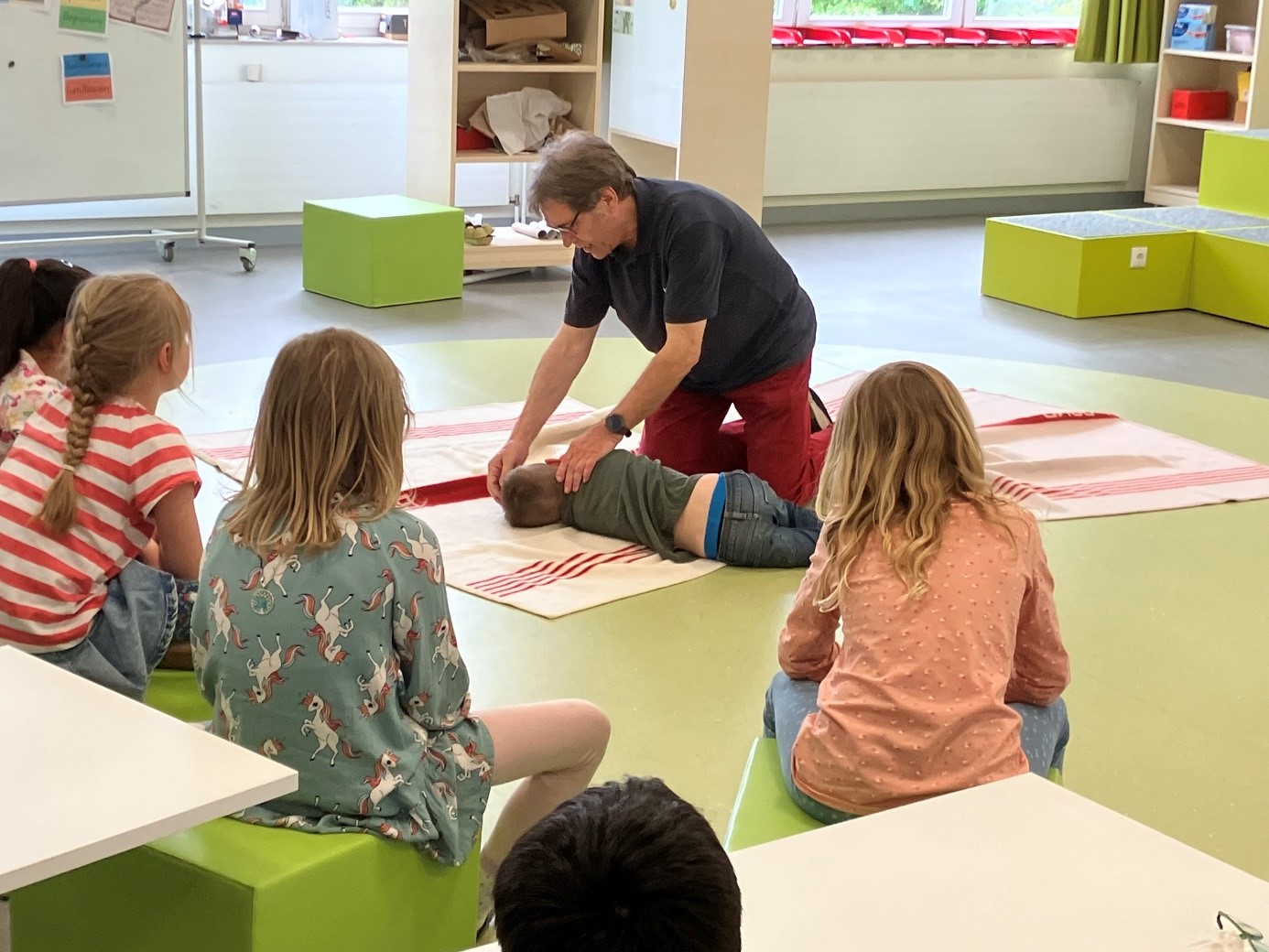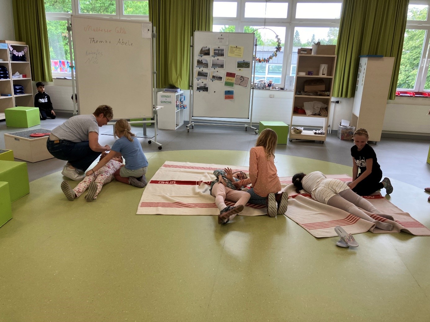 Viele unserer Schülerinnen und Schüler beschäftigten sich in den letzten Wochen im Ganztag damit, was im Notfall zu tun ist, wie z.B. einen Notruf korrekt abzusetzen. Zudem erlernten sie Erste-Hilfe-Maßnahmen wie die stabile Seitenlage und das Anlegen von Wundverbänden.