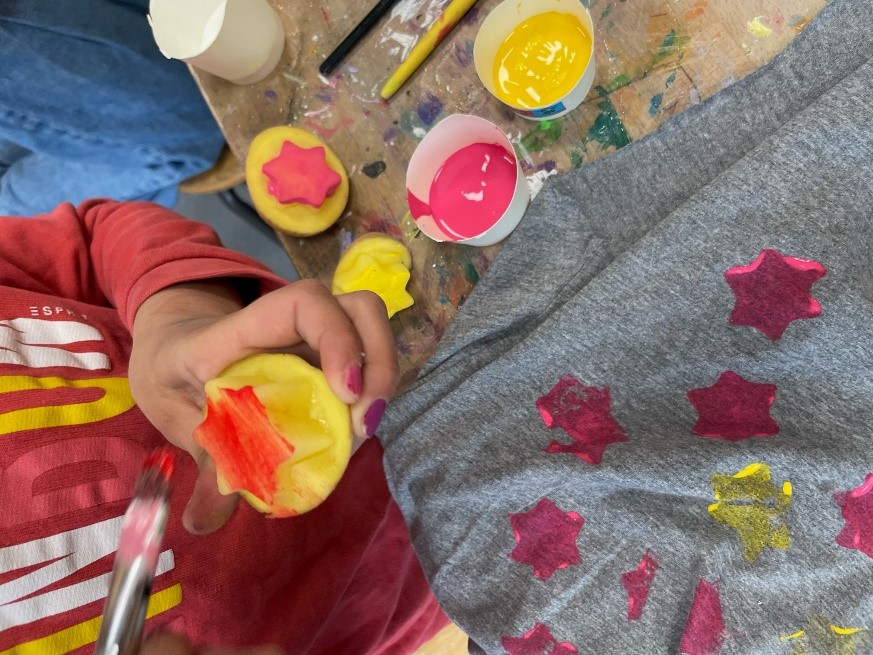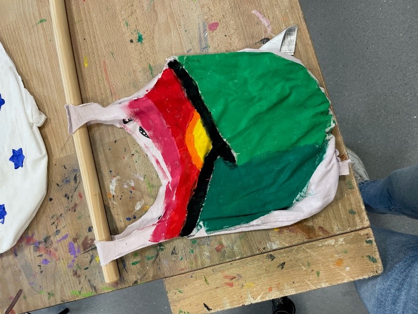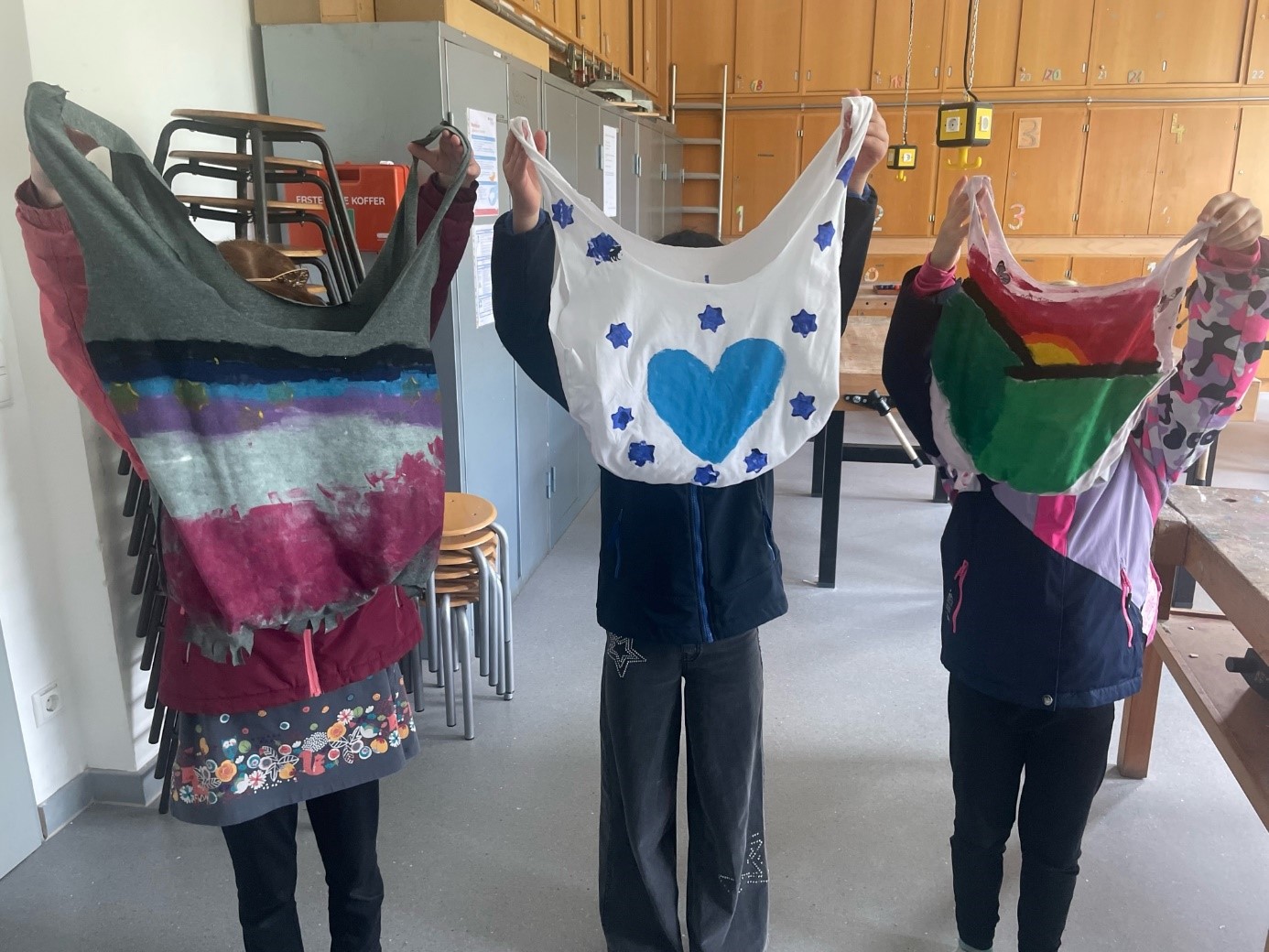Kinder der 3. Klassen haben im Ganztag individuelle Taschen aus alten T-Shirts erstellt.