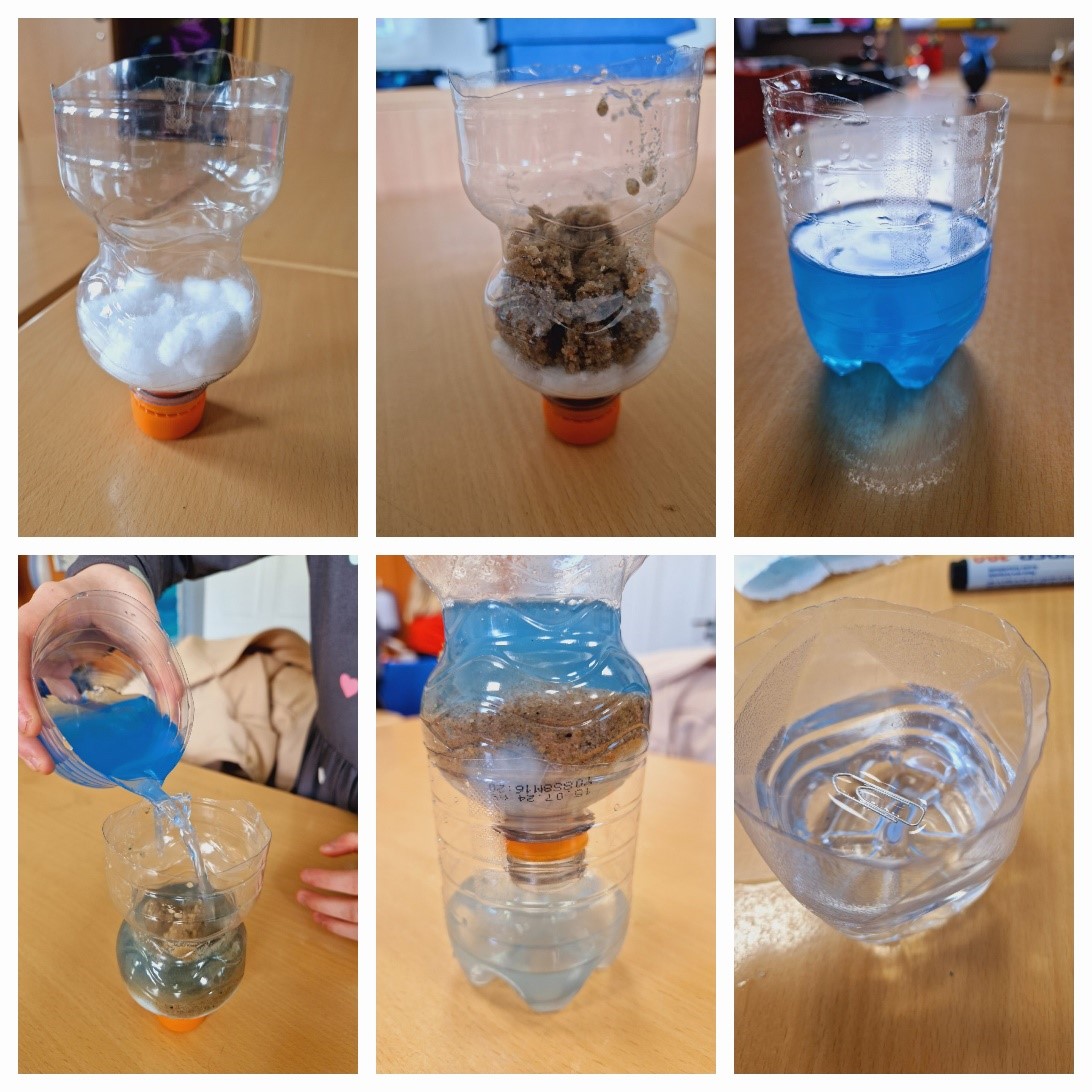 Sie bauten ihre eigene Filteranlage. Alles, was sie dafür benötigten, waren eine leere PET-Flasche, etwas Watte, Sand und blau eingefärbtes Wasser mit etwas Seife darin.