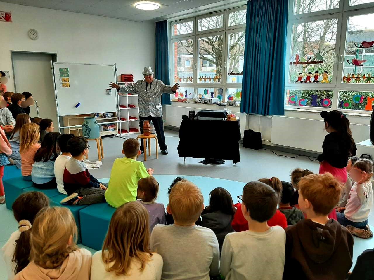 Kurz vor den Osterferien hatte unser Ganztag Besuch von Henry dem Zauberer. Alle Jahrgänge konnten sich die Zaubershow auf einem unserer Marktplätze anschauen und dabei mitmachen.