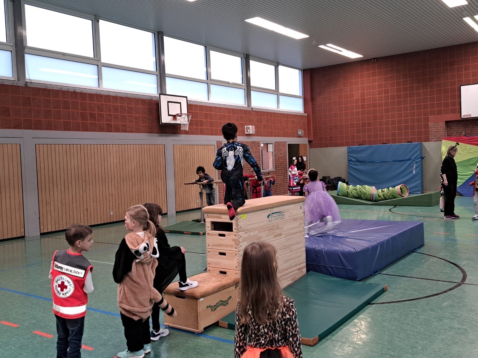 Fasching ist (fast) alles möglich und erlaubt. So war es auch am Freitag, d. 8. Februar 2024, bei uns in der Grundschule. Piraten feierten mit Polizisten, Super Mario schlüpfte aus der virtuellen Welt, Zauberer trafen auf Prinzessinnen, berühmte Sängerinnen naschten mit leidenschaftlichen Fußballern vom Buffet und alle hatten viel Spaß. Unter der Regie von Frau Lerbs hatte sich die Sporthalle in eine bunte Bewegungslandschaft verwandelt, in der die Jahrgänge ausgelassen feiern und „turnen“ konnten. Wir hatten einen schönen, nur leider viel zu kurzen Faschingsfreitag und freuen uns schon auf nächstes Jahr.