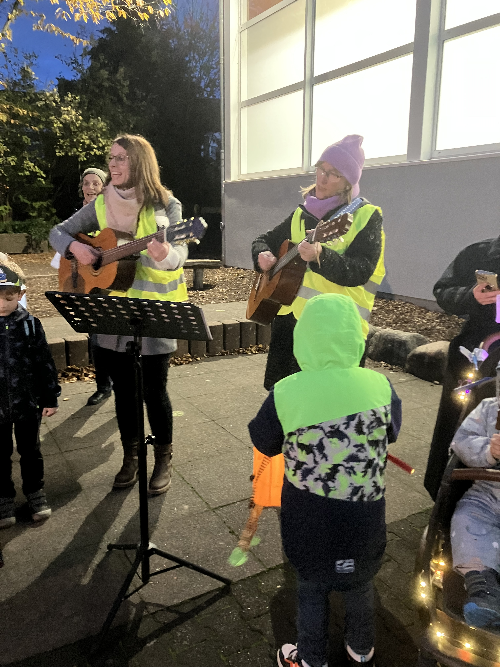 So erklang es zur Gitarrenbegleitung am Montag, d. 6.11.23, auf unserem Schulhof. Bei Einbruch der Dunkelheit versammelten sich die Kinder mit ihren bunten Laternen in Begleitung ihrer Eltern, Großeltern und Geschwister auf unserem Schulhof. Gemeinsam machten wir uns dann auf den Weg durch den Französischen Garten. Dabei wurden immer wieder gemeinsam Lieder gesungen, die die Kinder im Musikunterricht einstudiert haben. Gegen 18.15 endete ein schönes Laternenfest vor dem Alten Rathaus.