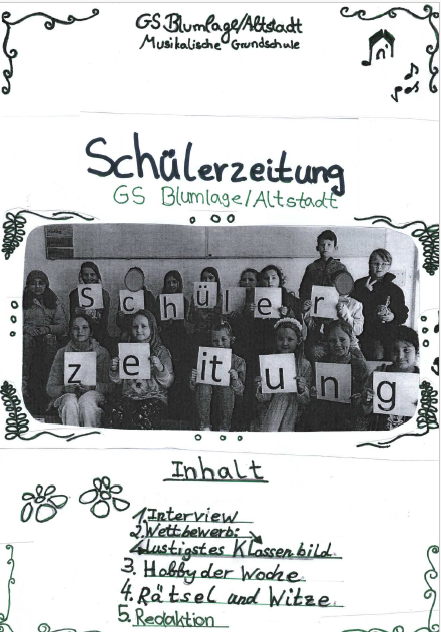 Die Kinder unserer Schule hatten die Möglichkeit die erste Schülerzeitung „Schülerzeitung GS Blumlage /Altstadt“ zu erstellen. In verschiedenen Gruppen arbeiteten Groß und Klein eng zusammen. Hierbei konnten die rasenden Reporter ihrer Kreativität und Neugier freien Lauf lassen. Es wurde ein Interview geführt, ein Rezept erstellt, ein Fotowettbewerb ausgeschrieben und eine Rätselseite erarbeitet. Dadurch ist eine tolle Schülerzeitung entstanden mit den Wunschthemen und Interessen der Kinder.