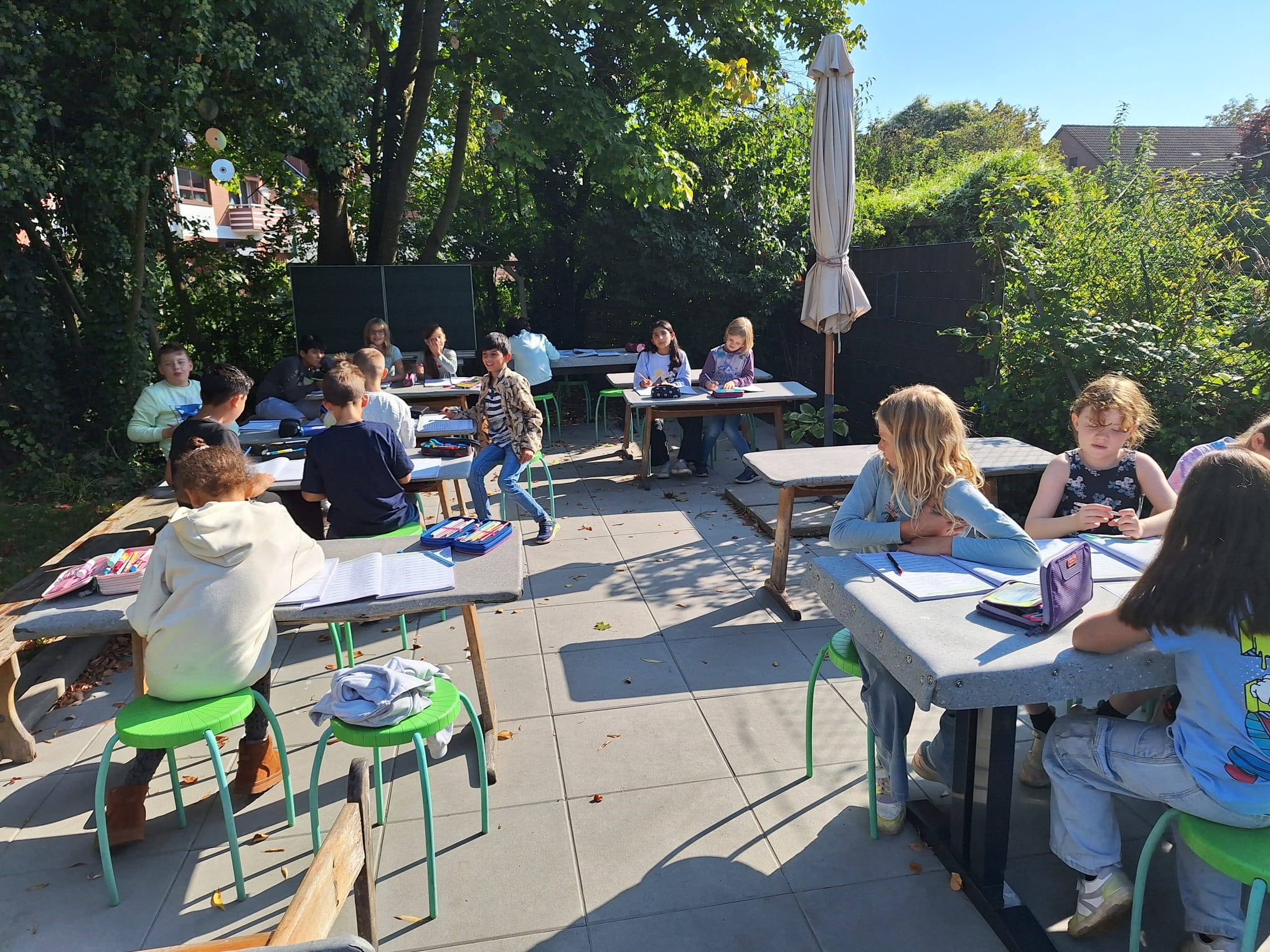 Die Klasse 3b lernt im grünen Klassenzimmer bei schönstem Septemberwetter. Zwischendurch werden Frühblüher in das Klassenbeet gepflanzt.