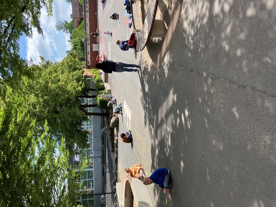 Die Klasse 1a schreibt ein Diktat – nicht ins Heft, sondern auf den Schulhof.