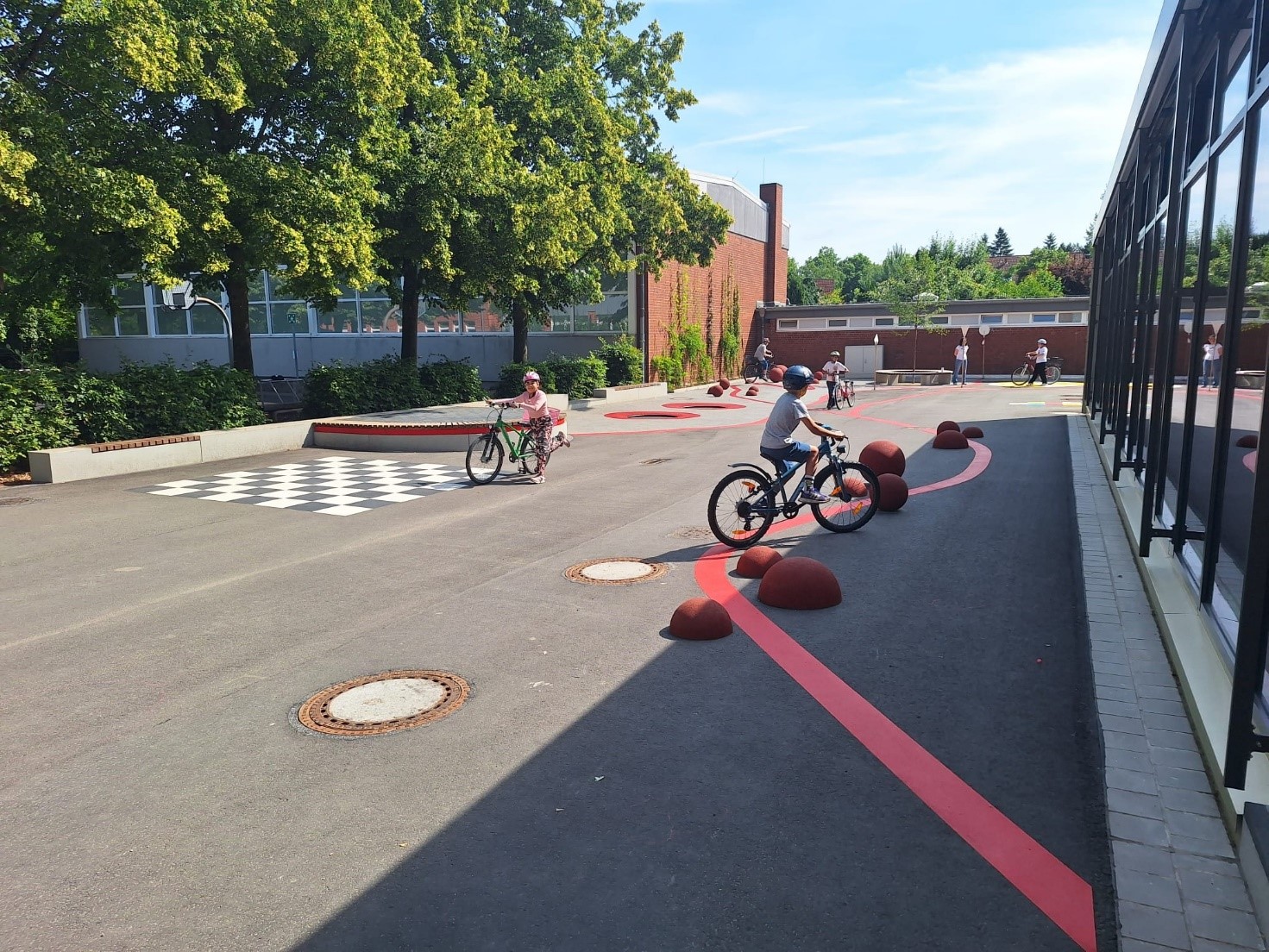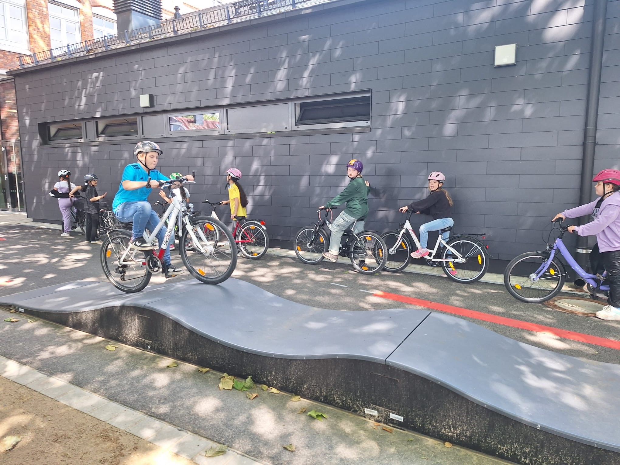 Auch der 3. Jahrgang führte bei schönem Wetter auf dem Schulhof ein Fahrradtraining durch. Schulterblick und Handzeichen geben waren nur einige Punkte, die eingeübt wurden. Außerdem wurden neue Stationen wie die Rampe oder Slalomfahren ausprobiert.