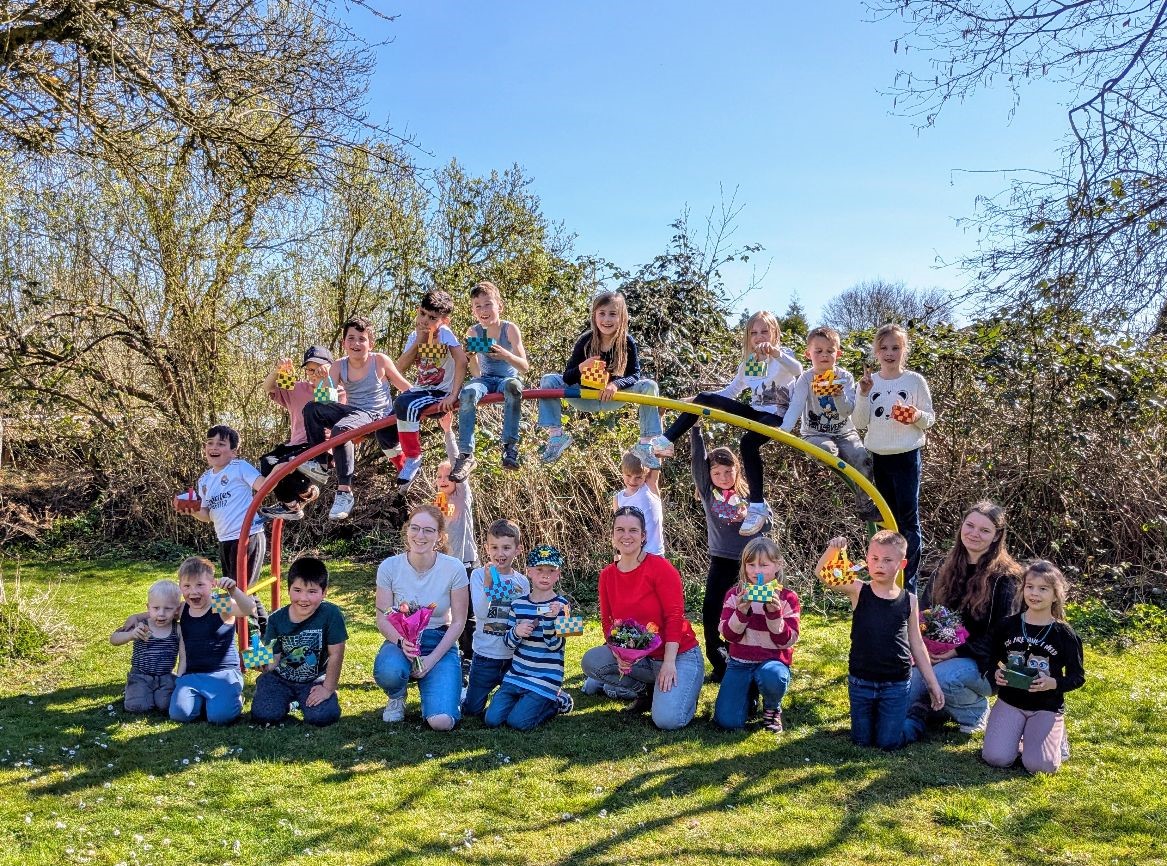 Am letzten Schultag vor den Osterferien machte sich die Klasse 1a auf Ostereiersuche. Nach einem kurzen Fußmarsch über den Osterdeich wurde ein Spielplatzstopp an dem KGV Hospitalwiesen eingelegt.