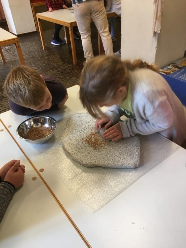 Anschließend probierten die Kinder mit viel Eifer in Kleingruppen mit einfachsten Hilfsmitteln Getreide zu mahlen. Getreidekörner wurden mit großem Kraftaufwand zwischen zwei Steinplatten hin und her gerieben, gepresst oder gestoßen.